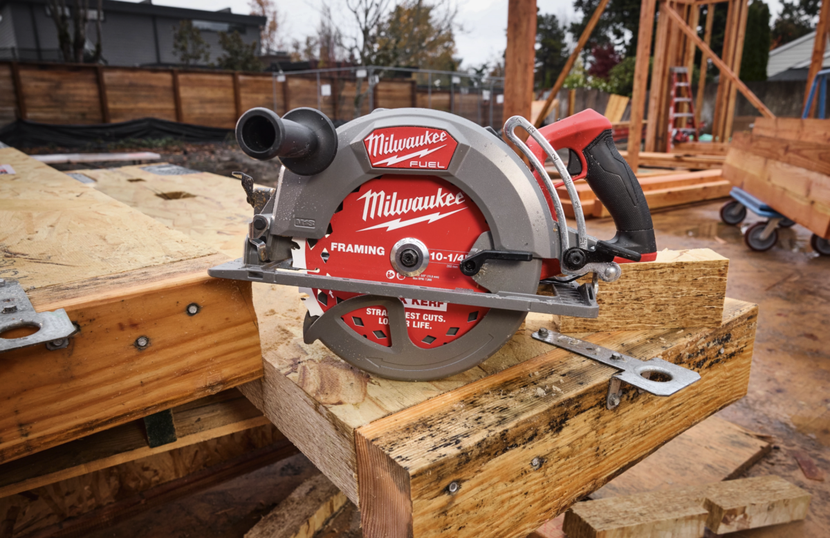 Engineered with Professional carpenters, remodelers, and general contractors in mind, the M18 Fuel 10 1/4-Inch Rear Handle Circular Saw is the largest cordless circular saw in Milwaukee’s cordless lineup. It’s powered by a brushless motor with a top speed of 3,250 RPMs and a max cut depth of 3 13/16 inches at 90°. This allows it to power through 4x lumber in a single pass, improving accuracy and consistency.