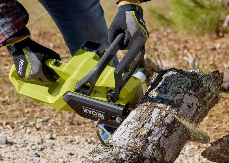 It’s equipped with most of the features we like to see even in larger chainsaws, like a variable speed trigger, an auto-oiler, and a mechanical chain brake. For chain tensioning, Ryobi went with a tooled system, and it includes a scrench that conveniently stores onboard the tool.