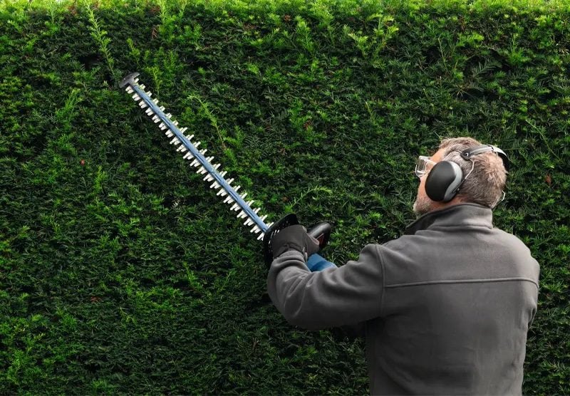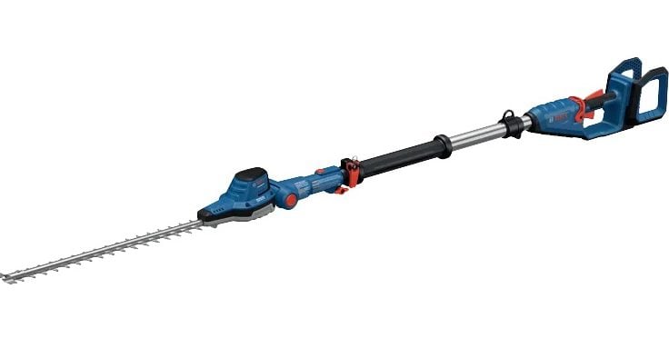 Along with the standard hedge trimmer mentioned above, Bosch also added a telescoping pole hedge trimmer to its 18V repertoire. It features an articulating head that pivots between -45° and 90° to reach branches at height at any angle. When fully extended, it has a length of 8.2 feet, which is around a 12-foot reach for a 6-foot-tall user.