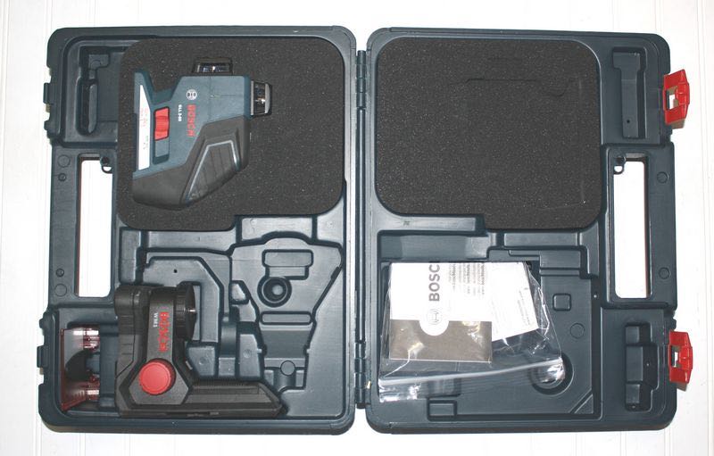 The Bosch GLL2-80 laser level arrived in a heavy-duty hinged plastic carry case. Inside the case, the laser level is cradled in thick foam padding that will protect it from most jobsite bumps when it is not in use. Along with the line laser, there is a separate adjustable height mount. The body of the Bosch GLL2-80 is made of tough ABS plastic with black rubber overmold that covers nearly half of the tool.