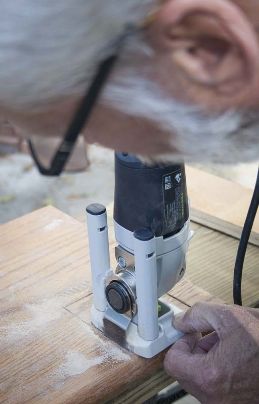 The Plunge Base seemed particularly good for cutting out a square for a newel post in the bottom tread of a wooden staircase. This would work on new construction but would be even more apropos if you were keeping a tread and replacing just the post. To test this out, we took a piece of 5/4 tread and drew out a square for our post. Then we grabbed the plunge base and attached it—an easy process.