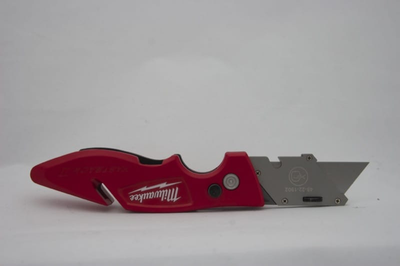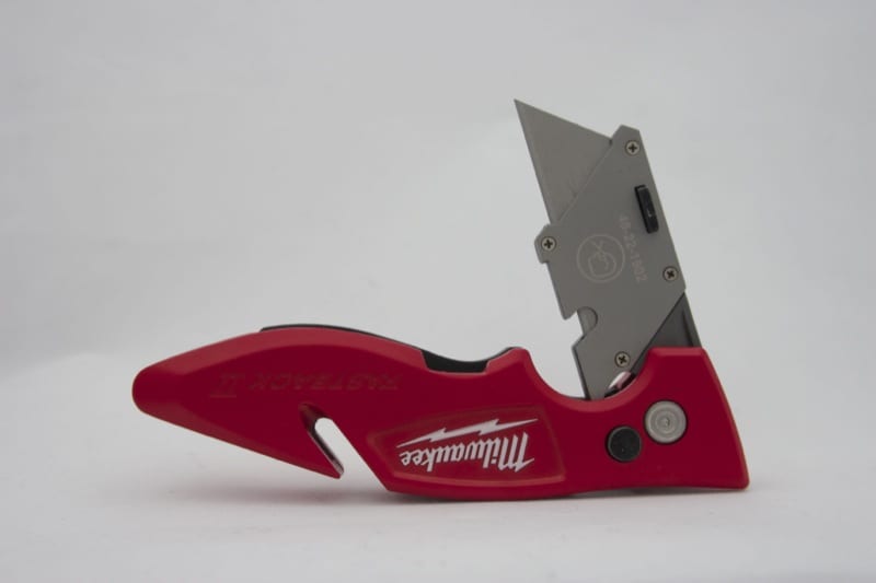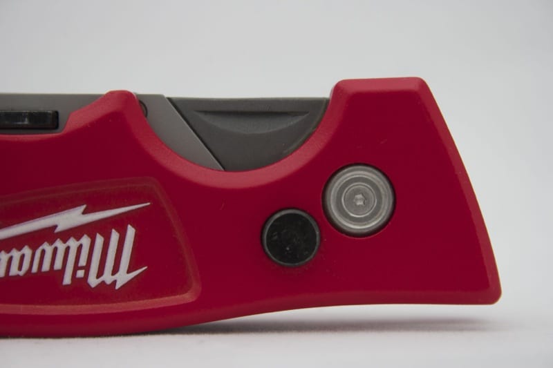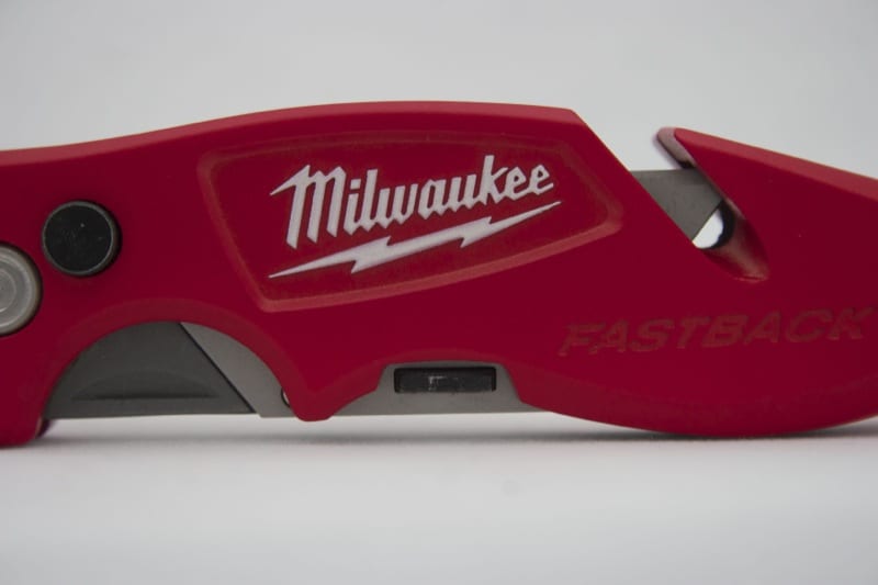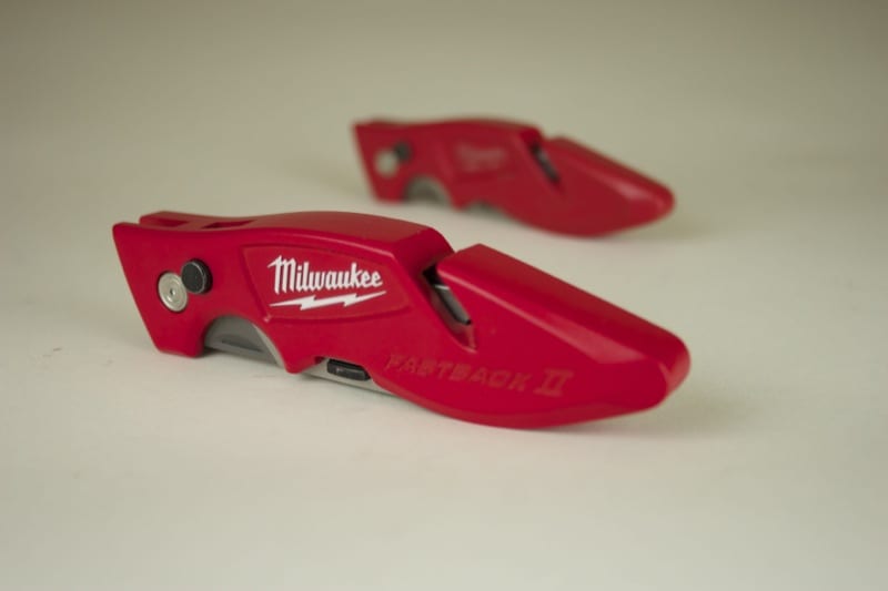 What makes the Fastback II an updated model, however, is the inclusion of blade storage. We’re excited that Milwaukee listened to its users. This was the #1 requested feature for this knife. It only took Milwaukee Tool about a year to make it a reality. But they got a little fancy on us. Instead of the typical loose holder to store a few blades, Milwaukee opted for a swing arm with a rare-earth magnet. You can technically insert a second blade, but it’s not really designed for it. Additionally, a pair of thicker blades will not fit. A simpler holder would have allowed users to store more than one extra blade.