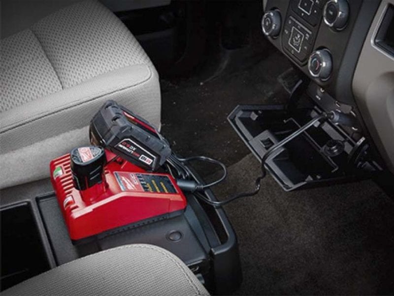 When you need to charge batteries on the go, the Milwaukee M18/M12 Vehicle Charger is your best bet. Its 2.5 amps charge a little slower than the standard charger, but you don’t need an AC plug to run this one.