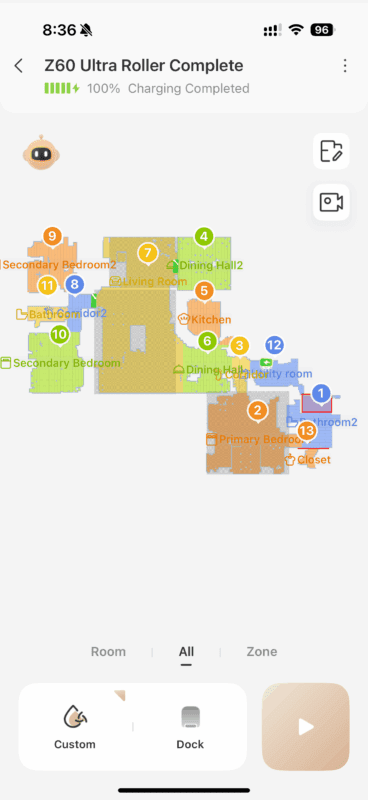 When the Z60 vacuums and/or mops areas, the map indicates this with a path line. You can see below where the MOVA Z60 auto-detected a throw rug by the lanai and how it segmented our home into rooms.