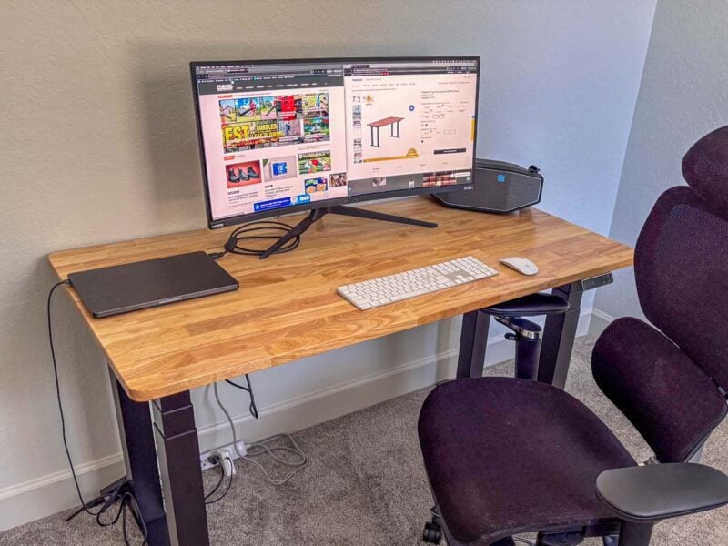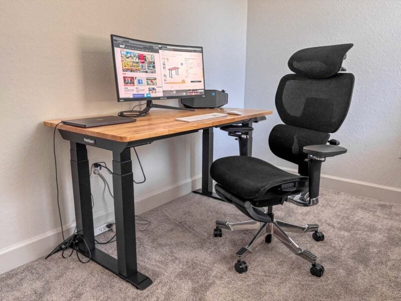 We paired this desk with Flexispot’s C7 Morpher ergonomic chair. If you’re having issues finding a comfortable fit on your current office chair, this model has more adjustability than any other chair we’ve used!