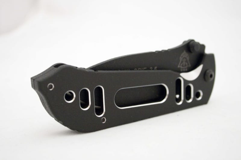 The center oval is actually a bottle opener. Top may not have designed the Tops Mil-SPIE 3.5 folder that way. If not, then you heard it here first. Oddly enough, the aluminum used in the handle of this knife is the same kind used in the secondary chambers of many pistol suppressors.
